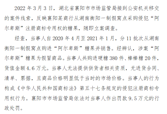 五、湖北省襄阳市市场监管局查处邱某销售侵犯“阿尔卑斯”注册商标专用权的糖果案
