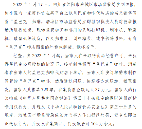 六、四川省绵阳市涪城区市场监管局查处孔某某生产销售假冒“星巴克”咖啡案