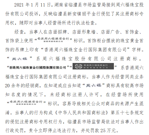 八、湖南省临澧县市场监管局查处临澧县新安镇丽平金行侵犯“周六福”注册商标专用权案