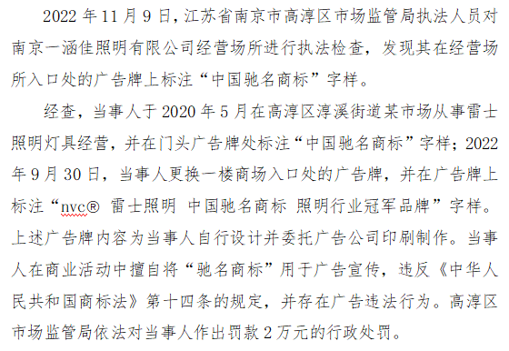 九、江苏省南京市高淳区市场监管局查处南京一涵佳照明有限公司将“驰名商标”用于宣传案