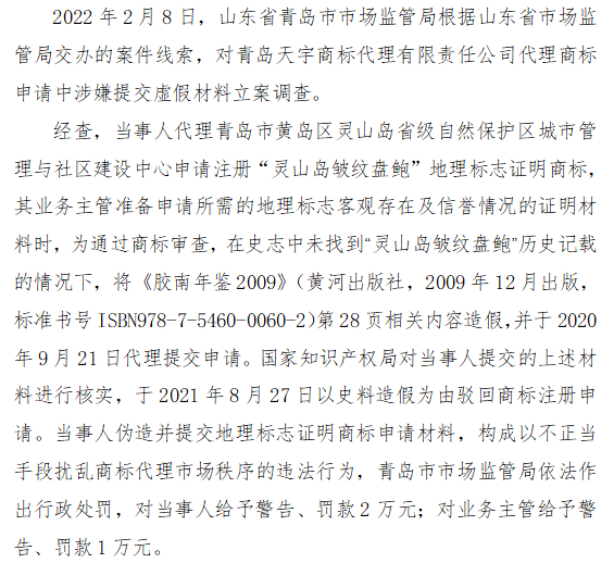 十一、山东省青岛市市场监管局查处青岛天宇商标代理有限责任公司以不正当手段扰乱商标代理市场秩序案