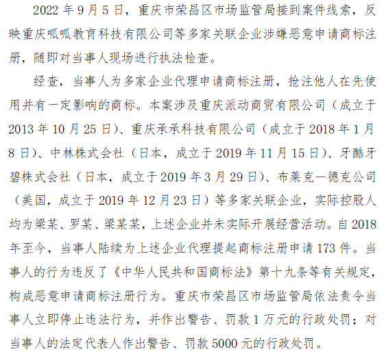 十二、重庆市荣昌区市场监管局查处重庆呱呱教育科技有限公司代理不以使用为目的恶意申请商标注册案