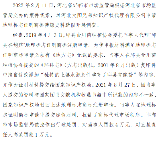 十三、河北省邯郸市市场监管局查处河北太阳兄弟知识产权代理有限公司扰乱商标代理市场秩序案