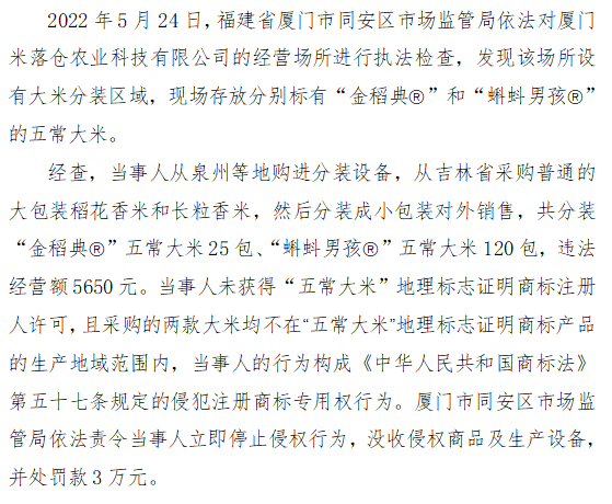 十四、福建省厦门市同安区市场监管局查处厦门米落仓农业科技有限公司侵犯“五常大米”地理标志证明商标专用权案