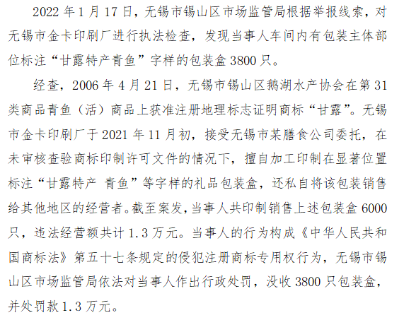 十五、江苏省无锡市锡山区市场监管局查处无锡市金卡印刷厂擅自印制地理标志证明商标案