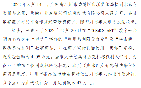 十七、广东省广州市番禺区市场监管局查处广州麦塔沃司信息技术有限公司侵犯奥林匹克标志专有权案