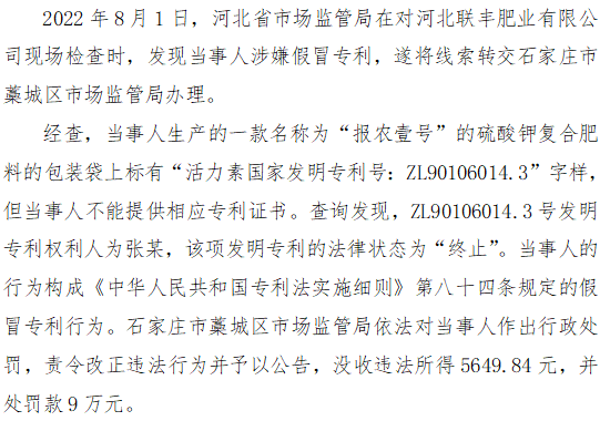 十八、河北省石家庄市藁城区市场监管局查处河北联丰肥业有限公司生产销售假冒专利的化肥案