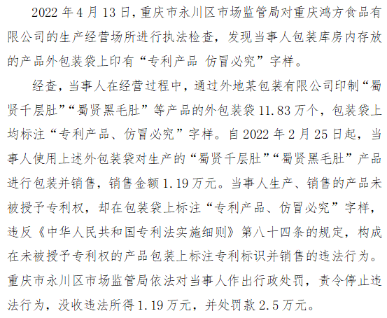 十九、重庆市永川区市场监管局查处重庆鸿方食品有限公司假冒专利案