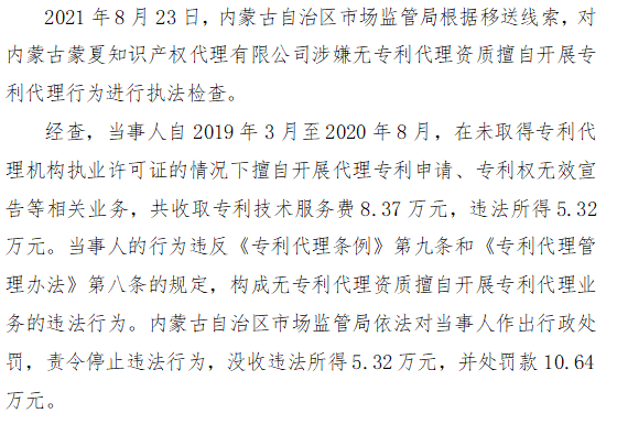 二十、内蒙古自治区市场监管局查处内蒙古蒙夏知识产权代理有限公司擅自开展专利代理业务案