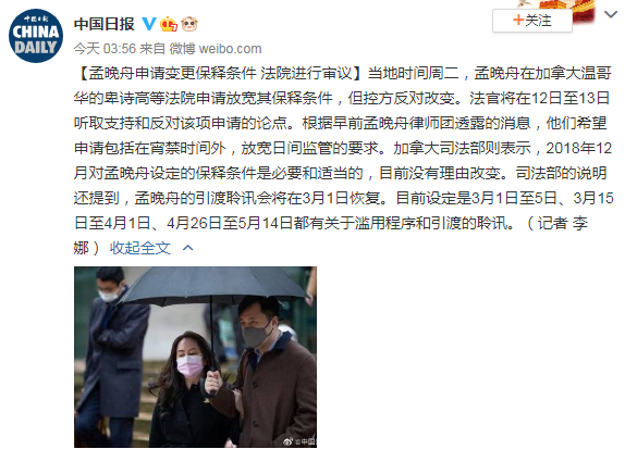 据中国日报官方微博,当地时间周二,孟晚舟在加拿大温哥华的卑诗高等法院申请放宽其保释条件,但控方反对改变。法官将在12日至13日听取支持和反对该项申请的论点。