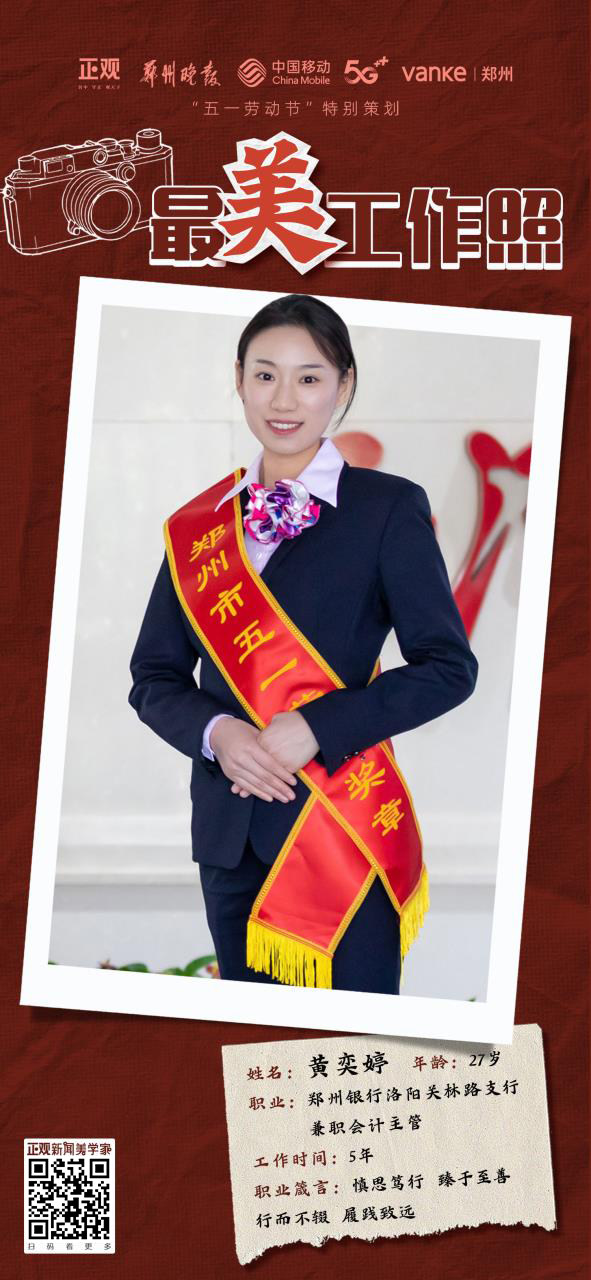 人物名片:黄奕婷,女,汉族,1995年5月出生,现为郑州银行洛阳关林路支行兼职会计主管。先后获得“优秀柜员”、“服务标兵”等荣誉称号,并在2022年度郑州市举办的第十九届职工技术运动会中摘得手工点钞识假项目第一名桂冠。