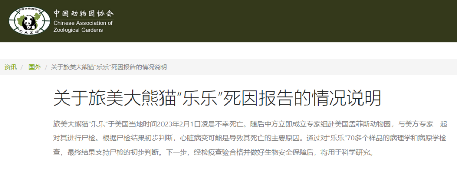 据中国动物协会官网发布的《关于旅美大熊猫“乐乐”死因报告的情况说明》显示,旅美大熊猫“乐乐”于美国当地时间2023年2月1日凌晨不幸死亡。随后中方立即成立专家组赴美国孟菲斯动物园,与美方专家一起对其进行尸检。根据尸检结果初步判断,心脏病变可能是导致其死亡的主要原因。通过对“乐乐”70多个样品的病理学和病原学检查,最终结果支持尸检的初步判断。下一步,经检疫查验合格并做好生物安全保障后,将用于科学研究。