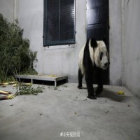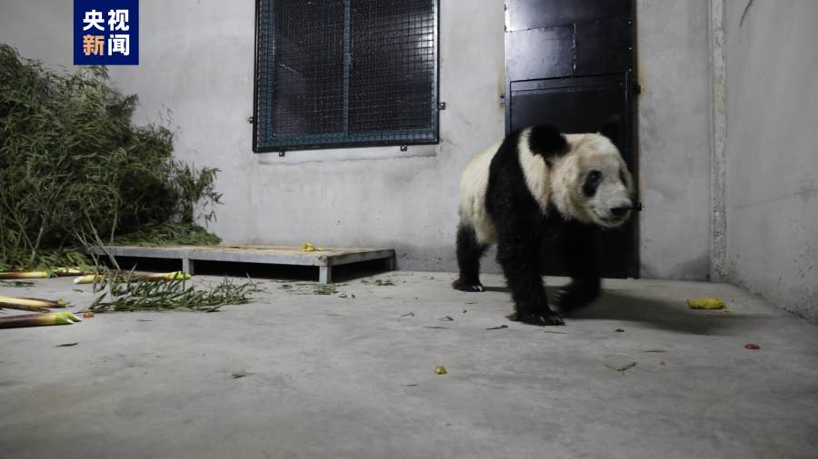 北京时间4月27日下午,23岁的旅美归国大熊猫“丫丫”抵达上海浦东国际机场,在中方兽医和工作人员的陪护下,前往封闭隔离检疫区。4月27日晚,“丫丫”已转移至隔离检疫区,图为“丫丫”在隔离检疫圈舍内。