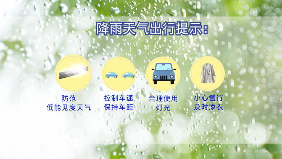 雨天道路湿滑、能见度低,出游及返程时需关注途中的交通出行安全,谨慎进行户外旅游活动。