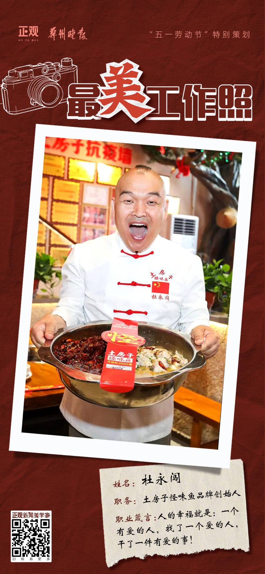 杜永闯,郑州土房子鱼锅饭店总经理,周口人,16岁开始学习厨艺,2007年独自创业在郑州货站街开了一家餐馆。经过多年的打拼,凭借憨厚仗义的为人及诚信经营的理念,成就了一个大厨当老板的梦想!