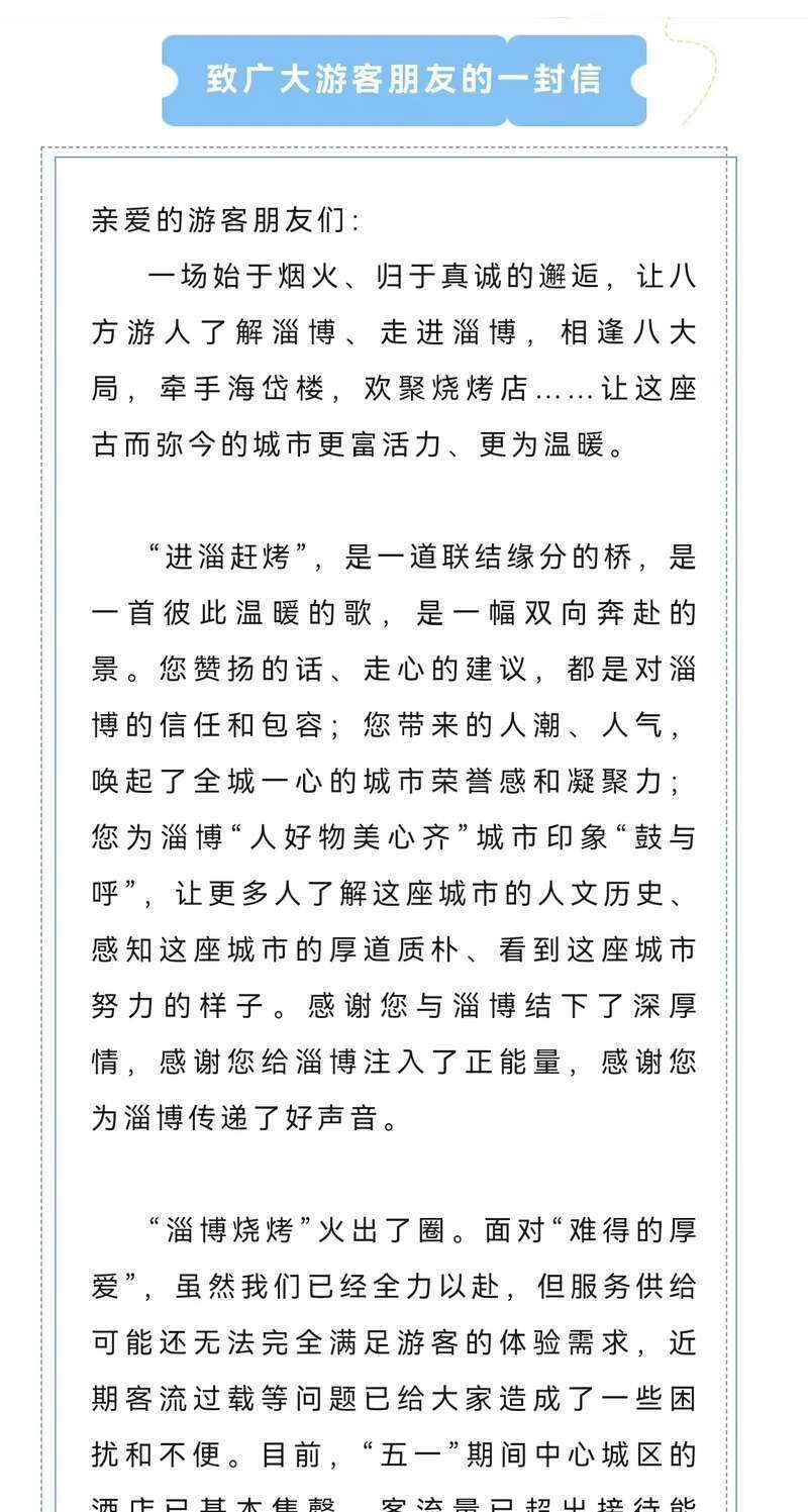 淄博又火了,这次是因为“劝退”。4月26日,山东省淄博市文旅局发布《致广大游客朋友的一封信》,信中说“五一”期间客流量已超出接待能力,建议游客错峰出游。淄博市文旅局在信中喊话推荐其他山东城市,称“美景美食不止淄博,好客山东应有尽有”。