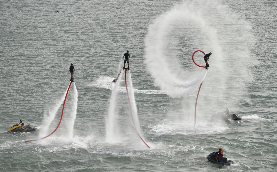 4月28日下午,炫酷的水上表演在龙湖水域上演,摩托艇劈波斩浪激起的水花,水上飞人展示的前后空翻、空中回旋、360度转体等酷炫特技,让湖中和岸边的气氛同时沸腾,也让游客们不禁纷纷举起了手中的手机和相机。记者 徐宗福 图