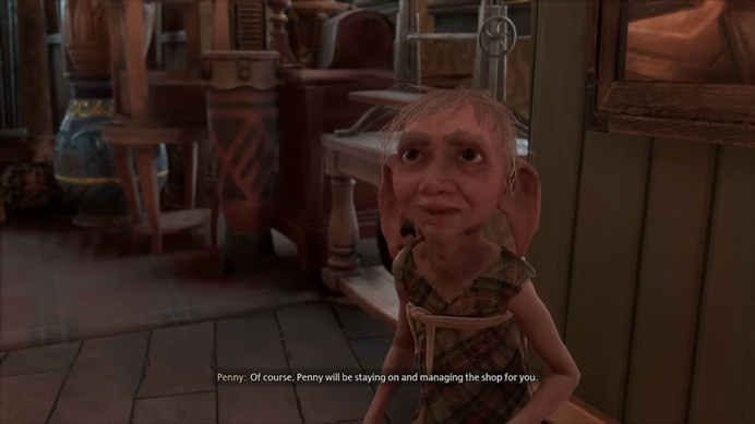 最后值得一提的是,当面对尖锐的历史遗留问题时,游戏制作组的态度是妥协和绥靖。正如前文所言,比起直面矛盾,制作组更倾向于悬置矛盾,并对尖锐的问题进行平滑处理,减轻它们带来的痛感。例如支线任务“创业二三事”的家养小精灵潘妮,玩家可以接收潘妮的所有权,把她变成服务于自己的奴隶,也可以选择让她自由。如果选择后者,小精灵会愉快地接受,并且还会和主角合作经营店铺。这与原著小说中对家养小精灵的描述相矛盾,因为在原著中,家养小精灵被视为低等生物,被巫师们奴役和虐待,除了异类多比,他们大多对自由没有清晰的认知,还把劳动报酬视作侮辱。原著中家养小精灵的设定是对何谓“自由”的一次深刻探索,也是直面奴隶制对人的异化的可贵尝试。但在游戏中,这个设定蕴含的尖锐矛盾被消解了,游戏在故事逻辑的合理性和现实世界玩家们的接受能力之间做了平衡,给游戏添加了一些违背故事逻辑但符合玩家期待或喜好的内容。这样的设定也反映了游戏制作组对原著中一些敏感元素的回避,以避免刺激到当下玩家的神经。因为在现代社会,很多玩家无法心安理得地接受自己扮演一个“奴隶主”。