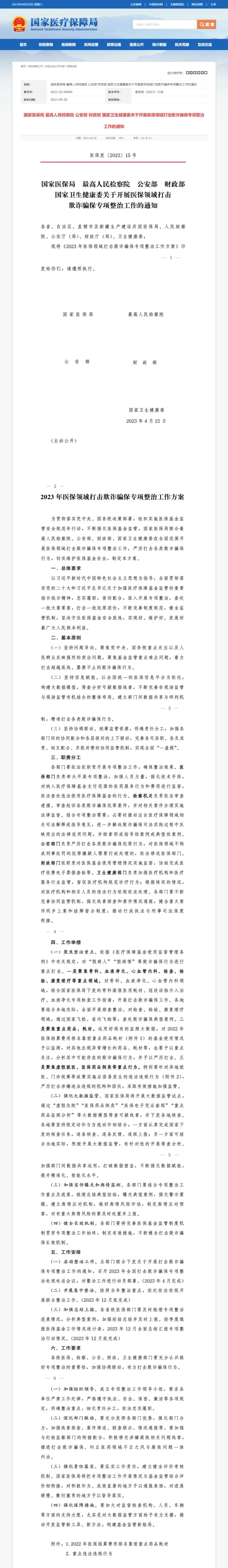 近日,国家医保局联合最高人民检察院、公安部、财政部、国家卫生健康委印发了《2023年医保领域打击欺诈骗保专项整治工作方案》(以下简称《方案》),在全国范围开展医保领域打击欺诈骗保专项整治工作。