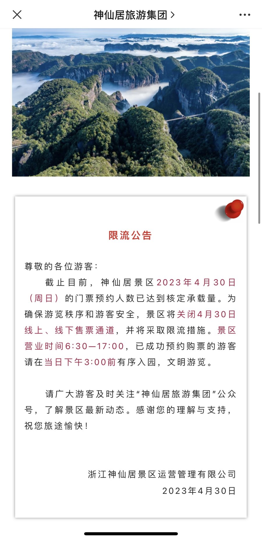 当日零点,浙江台州的神仙居旅游集团发布限流公告。公告显示,神仙居景区2023年4月30日(周日)的门票预约人数已达到核定承载量。为确保游览秩序和游客安全,景区将关闭4月30日线上、线下售票通道,并将采取限流措施。
