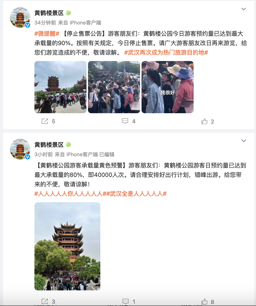 当日上午10时,武汉黄鹤楼景区发布公园游客承载量黄色预警,称黄鹤楼公园游客日预约量已达到最大承载量的80%,即40000人次。并带上#人人人人人你人人人人人#和#武汉全是人人人人人#两个话题标签。
