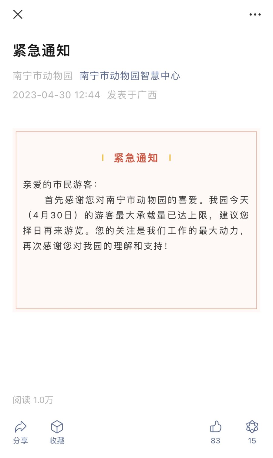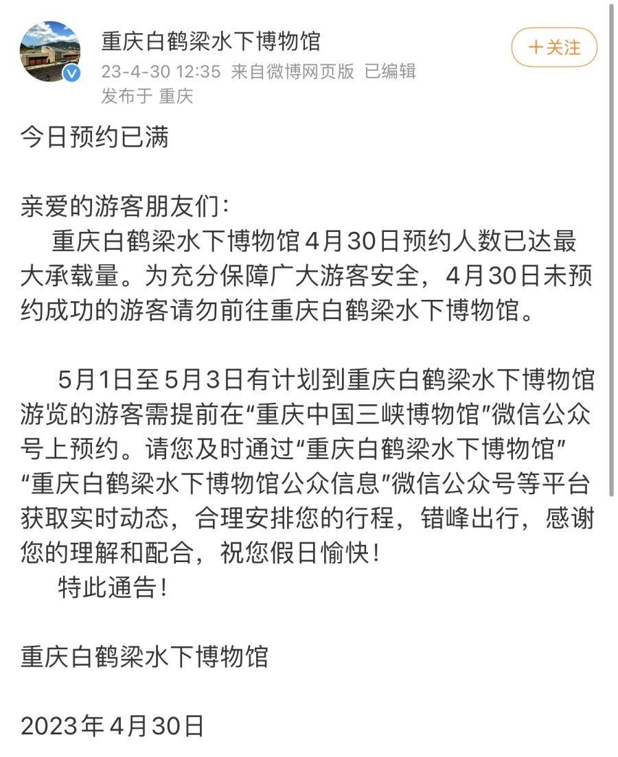 其中,南宁市动物园和重庆白鹤梁水下博物馆中午12时30分左右发布的消息均表示,当日游客或预约人数达最大承载量,建议游客改日游览。