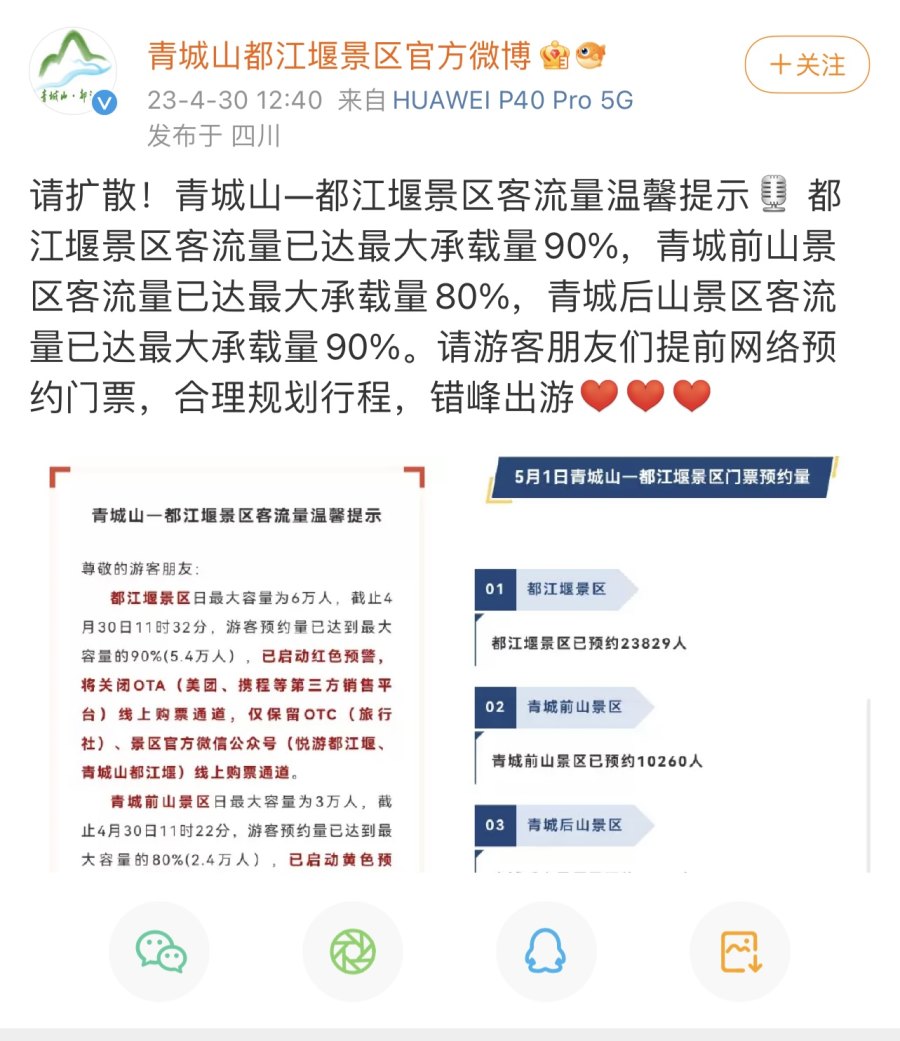 截至11时22分,青城山前山景区达最大承载量的80%(2.4万人),已启动黄色预警,将关闭在线旅游平台的购票通道,仅保留旅行社、景区官方微信公众号的线上购票通道。