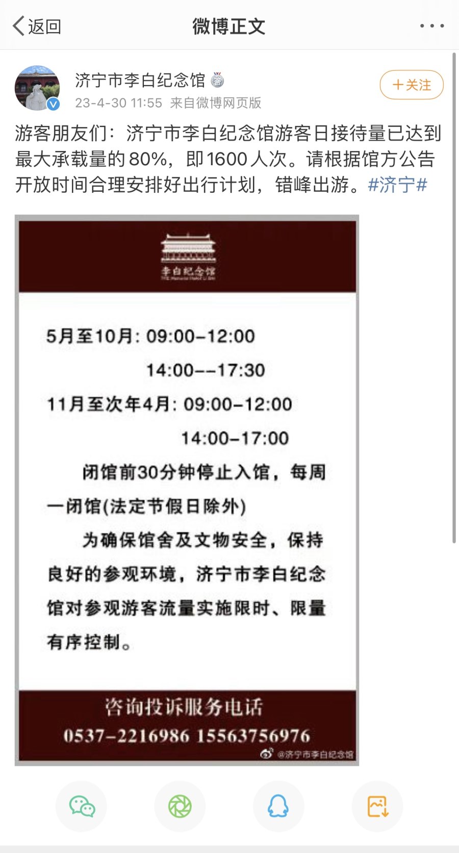 山东省济宁市李白纪念馆11时55分发布的消息称,游客日接待量已达到最大承载量的80%,即1600人次,建议游客错峰出游。
