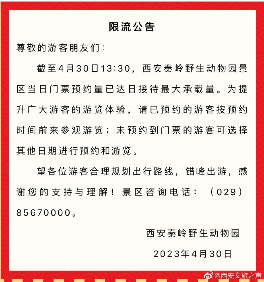 西安秦岭野生动物园发布停票限流的公告:截至4月30日13:30,西安秦岭野生动物园景区当日门票预约量已达日接待最大承载量。为提升广大游客的游览体验,请已预约的游客按预约时间前来参观游览;未预约到门票的游客可选择其他日期进行预约和游览。