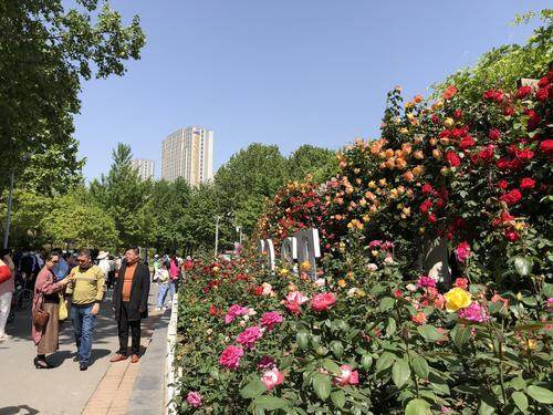 1日,记者在郑州植物园看到,西门内的欧式月季花廊前,大红、粉红、玫红、鹅黄等各色玫瑰娇艳绽放,形成一道唯美的花墙,扶老携幼的游客驻足花前,拍照留念,赞美之声不绝于耳。邻近的中式展区和田园展区内,大片的月季花、玫瑰花形成花的海洋,嗡嗡的蜜蜂在花间采蜜,游客陶醉花丛,留连忘返。公园北部的牡丹芍药园内,牡丹虽败,芍药正开,赤、白、粉、黄、绿,风姿万千,令游客大饱眼福。