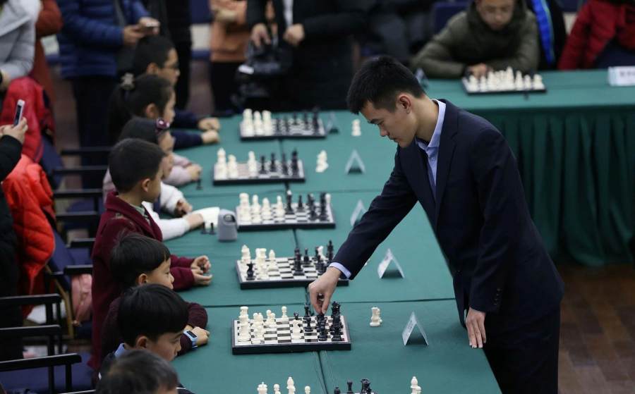 △2017年2月9日,在浙江温州举行的国际象棋比赛上丁立人“车轮战”过招棋迷