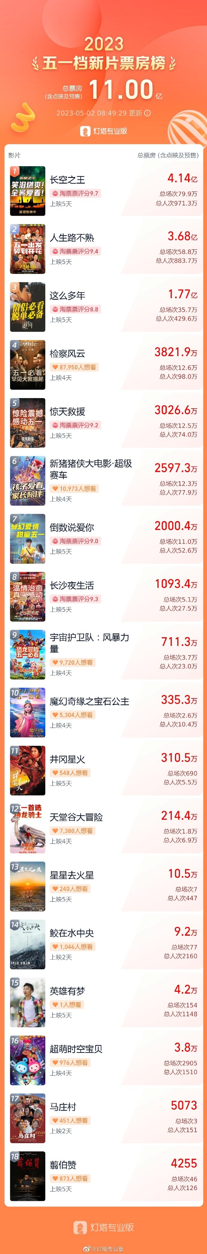 据灯塔专业版实时数据,截至5月2日8时49分,2023年五一档新片总票房(含预售)突破11亿。