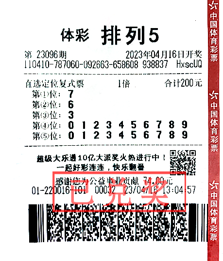 体彩排列5第23096期开出号码:“7 6 3 8 1”,王先生收获一等奖1注,奖金10万元,该张中奖票出自郑州4101220016体彩实体店。