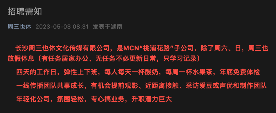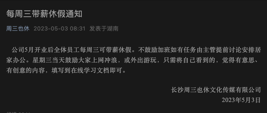 5月3日,湖南长沙。一传媒公司在其官方公众号发布消息称,全体员工每周三可带薪休假一天,鼓励公司员工每周三上网或外出游玩,且不提倡加班。