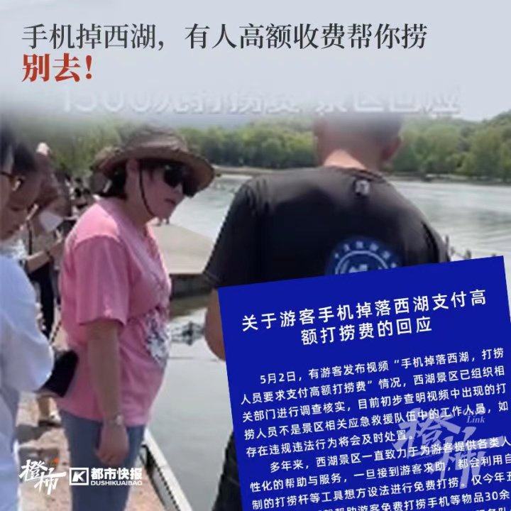 都市快报·橙柿互动第一时间发布了相关报道《游客手机掉进西湖,找人打捞竟收费1500元?景区刚刚回应:此人非工作人员,如遇类似情况可求助景区管理人员,免费!》
