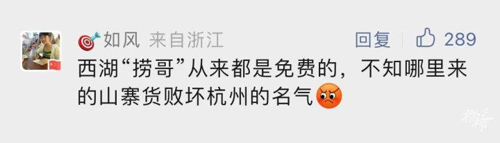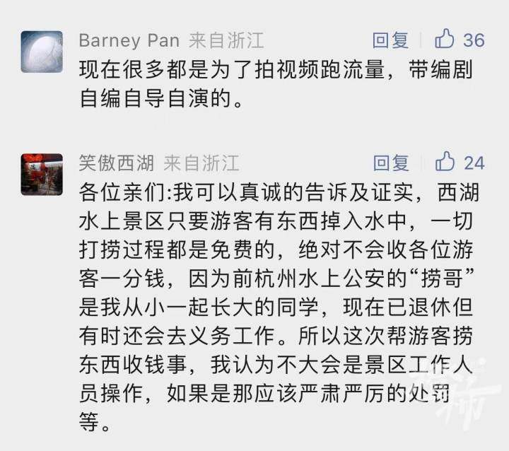 有人说,西湖“捞哥”从来都是免费的;也有人说,我可以真诚地告诉及证实,西湖景区只要游客有东西掉入水中,一切打捞过程都是免费的,绝对不会收一分钱。还有人建议,要严查这种抹黑西湖的行为。