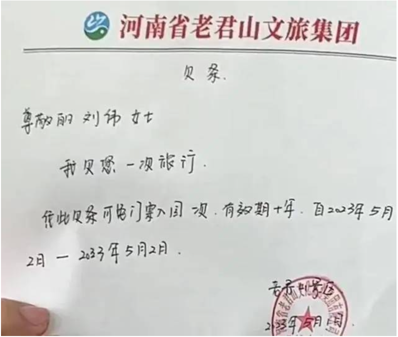 “我欠您一次旅行。凭此欠条可免门票入园一次,有效期十年。”5月4日,据媒体报道,洛阳栾川老君山景区5月1日因达到最大游客承载量,许多未预约却慕名而来的游客遭遇限流,为抚慰游客失落的心情,景区在门口为上千游客送上奶茶、鸡腿简餐,并打下这样一张欠条。