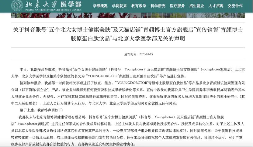 商家第二招靠“虚假营销”,钻监管漏洞。首先,这五个女博士真实身份存疑。北大医学部早在2020年就发布声明,表示与“五个女博士”无关系、无合作、无授权,也不支持该产品。其次,“五个女博士”产品大肆宣传的成分可能只是智商税。专家指出,目前没有证据表明胶原蛋白肽和部分抗糖物质具有美容功效。而打着“北大”噱头的“五大女博士”商家正是瞄准信息差,或无中生有式宣传,或玩起“文字游戏”,用“亢唐”、“亢餹”字眼代替“抗糖”,规避审查风险。