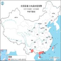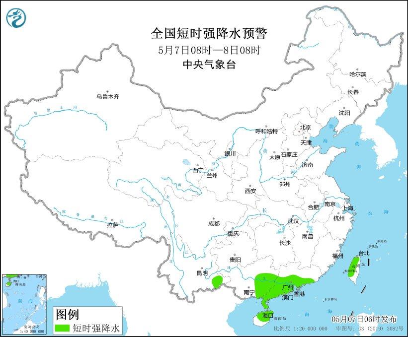 预计5月7日08时至8日08时,云南东南部、广西东南部、广东南部、海南岛东北部、台湾岛中北部等地的部分地区将有8-10级雷暴大风或冰雹天气;云南东南部、广西东部、广东中南部、海南岛中北部、台湾岛中北部等地的部分地区将有短时强降水天气,小时雨量20-40毫米,局地可达50毫米以上。