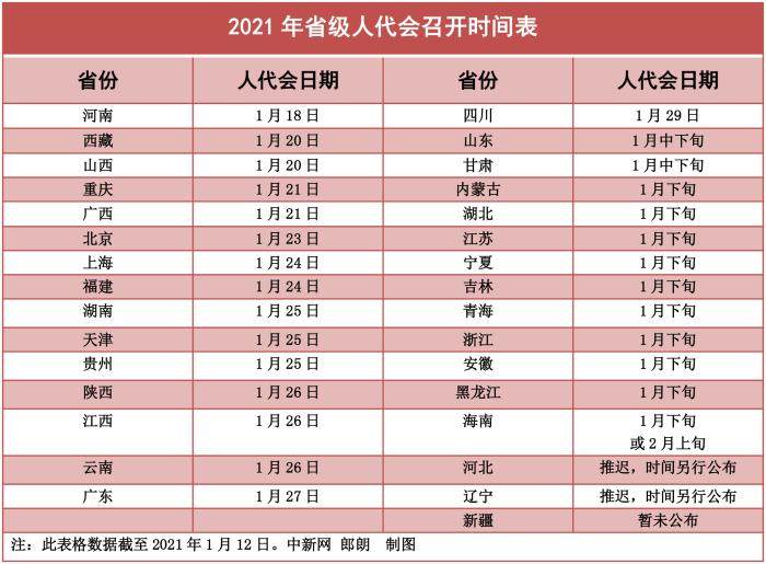 每年年初,各地将进入一年一度的省级地方两会时间。目前,近30个省份已经确定了省级人代会的召开时间,召开日期集中在1月中下旬。此外,辽宁、河北决定推迟召开省级人代会。