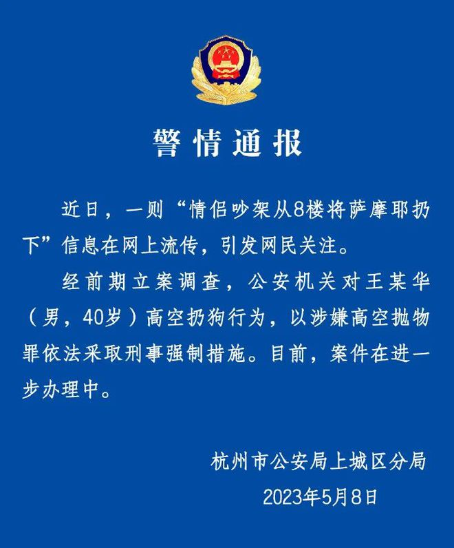 近日,一则“情侣吵架从8楼将萨摩耶扔下”信息在网上流传,引发关注。5月8日,浙江杭州市公安局上城区分局通报称,经前期立案调查,公安机关对王某华(男,40岁)高空扔狗行为,以涉嫌高空抛物罪依法采取刑事强制措施。目前,案件在进一步办理中。