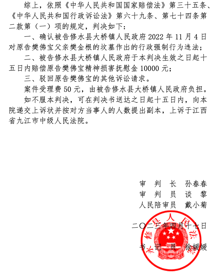 逝者家属对此提出行政诉讼,当地人民法院判决修水县大桥镇人民政府对逝者坟墓作出的行政强制行为违法,并判决大桥镇政府赔偿逝者家属精神损害抚慰金1万元。法院认为,土葬应予查处,但该案中程序不合规。