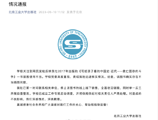 据北京工业大学出版社微信公众号,学校关注到网民发帖反映我社2017年出版的《写给孩子看的中国史·近代——救亡图存的斗争》一书插图使用不当。学校党委高度重视,责成我社迅速核实情况。经查,该图书确实存在不当插图问题。