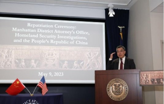 5月9日,经国家文物局授权,中国驻纽约总领事黄屏出席于纽约曼哈顿区检察官办公室举行的中国流失文物返还仪式,与美方签署返还协议,并接收2件重要石刻文物。