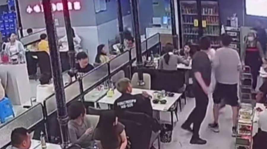 监控视频显示,邻桌几名男子先后坐到三名女生这一桌,虽然不知道具体说了什么,但从其中一女生找服务员解围不难看出,她们确实被打扰到了。而烤肉店小伙过来后,先是礼貌地跟男子握手,试图化解纠纷,结果却被另外两名男子推搡,甚至可以说是被强行带走,意思很明显:别多管闲事。