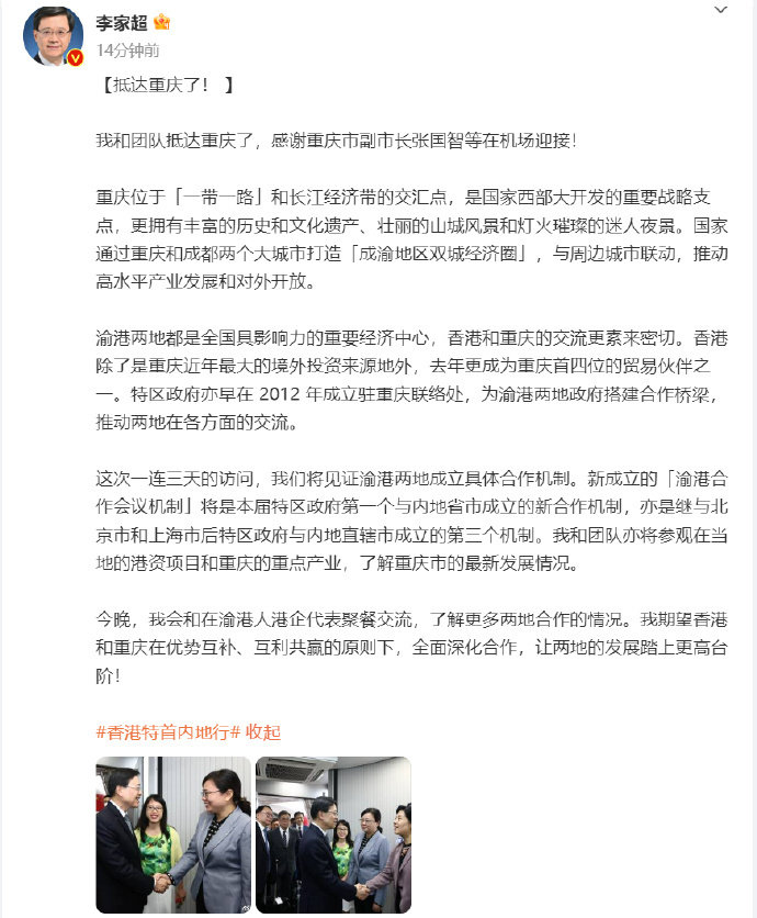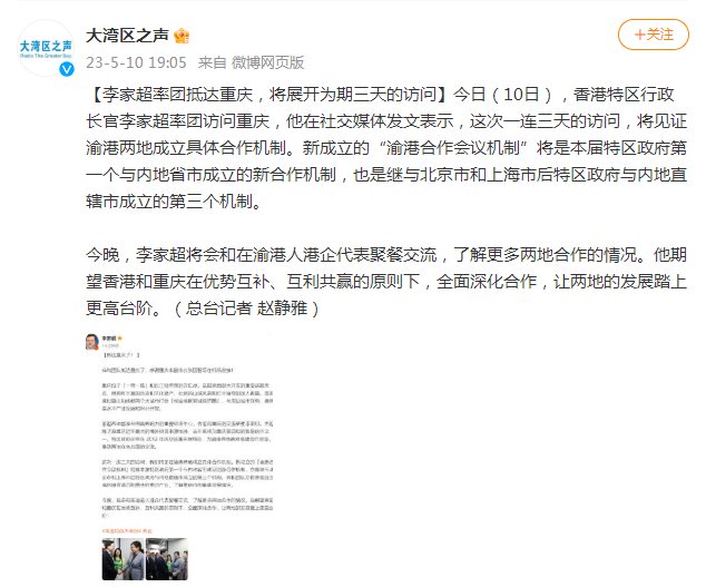 今日(10日),香港特区行政长官李家超率团访问重庆,他在社交媒体发文表示,这次一连三天的访问,将见证渝港两地成立具体合作机制。新成立的“渝港合作会议机制”将是本届特区政府第一个与内地省市成立的新合作机制,也是继与北京市和上海市后特区政府与内地直辖市成立的第三个机制。
