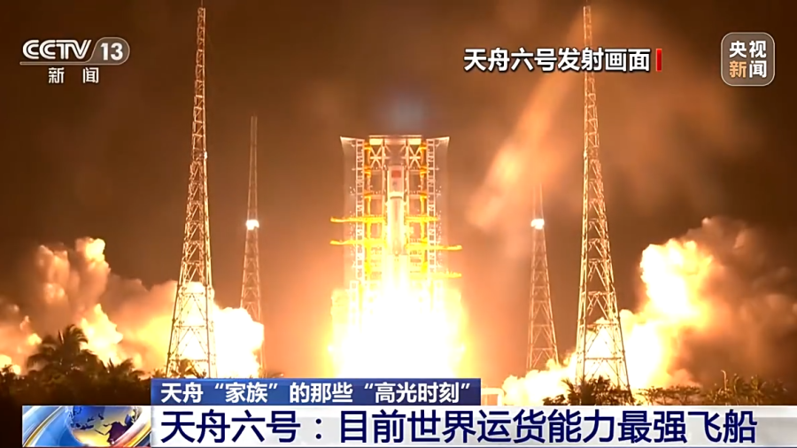 据中国载人航天工程办公室消息,北京时间10日21时22分,搭载天舟六号货运飞船的长征七号遥七运载火箭,在我国文昌航天发射场点火发射,约10分钟后,天舟六号货运飞船与火箭成功分离并进入预定轨道,之后,飞船太阳能帆板顺利展开工作,发射取得圆满成功。