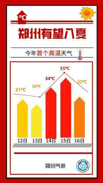 说郑州20天经历了四季一点不夸张!4月23日,遭遇强降温的郑州人还在穿厚衣;5月12日,郑州可能就要入夏了。记者从市气象部门获悉,今后七天,郑州晴热少雨,无明显大风天气,气温升高明显,5月12日以后最高气温均在30℃以上,其中5月15日最高气温或达36℃,有望迎来今年首个高温日,体验盛夏般的炎热。