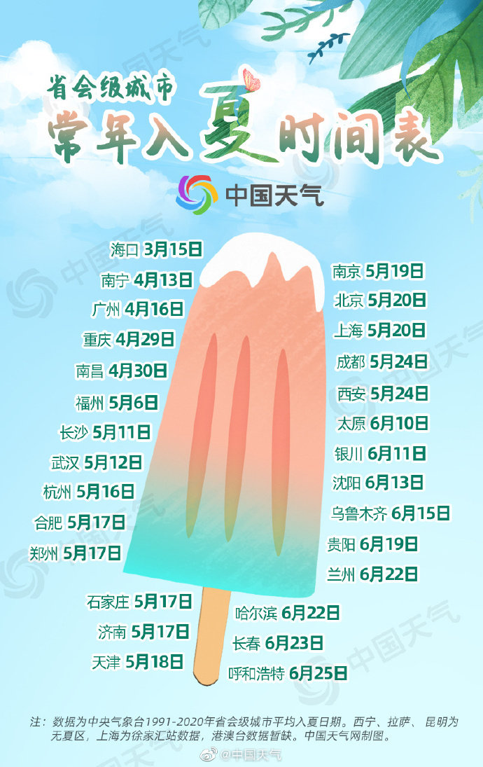全国入夏最早的省会级城市为海口,往往在3月就投入夏季怀抱;其次是南宁、广州、重庆、南昌,一般在4月完成春夏转换。