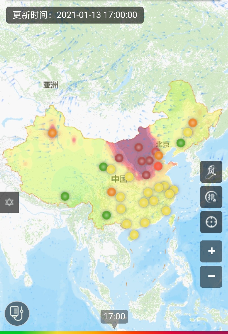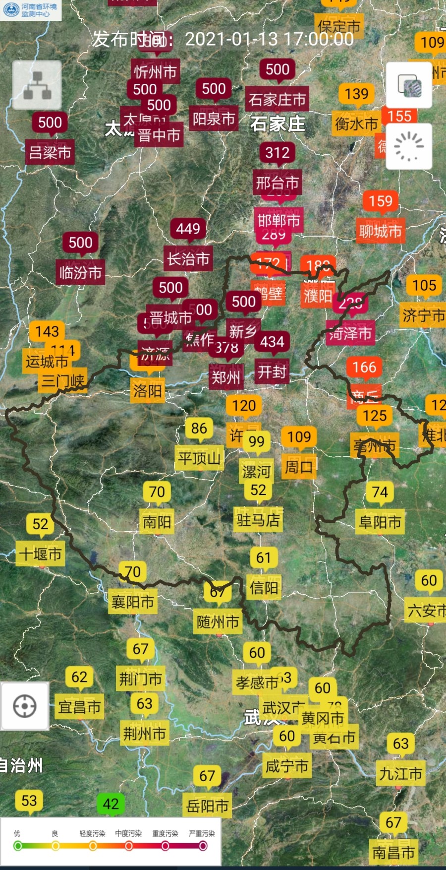 1月13日,受沙尘和PM2.5混合污染影响,河南北中部、东部和西部地区出现中度至重度污染过程,焦作、济源、新乡、郑州、开封等地出现空气质量综合指数达到350以上的严重污染时段。
